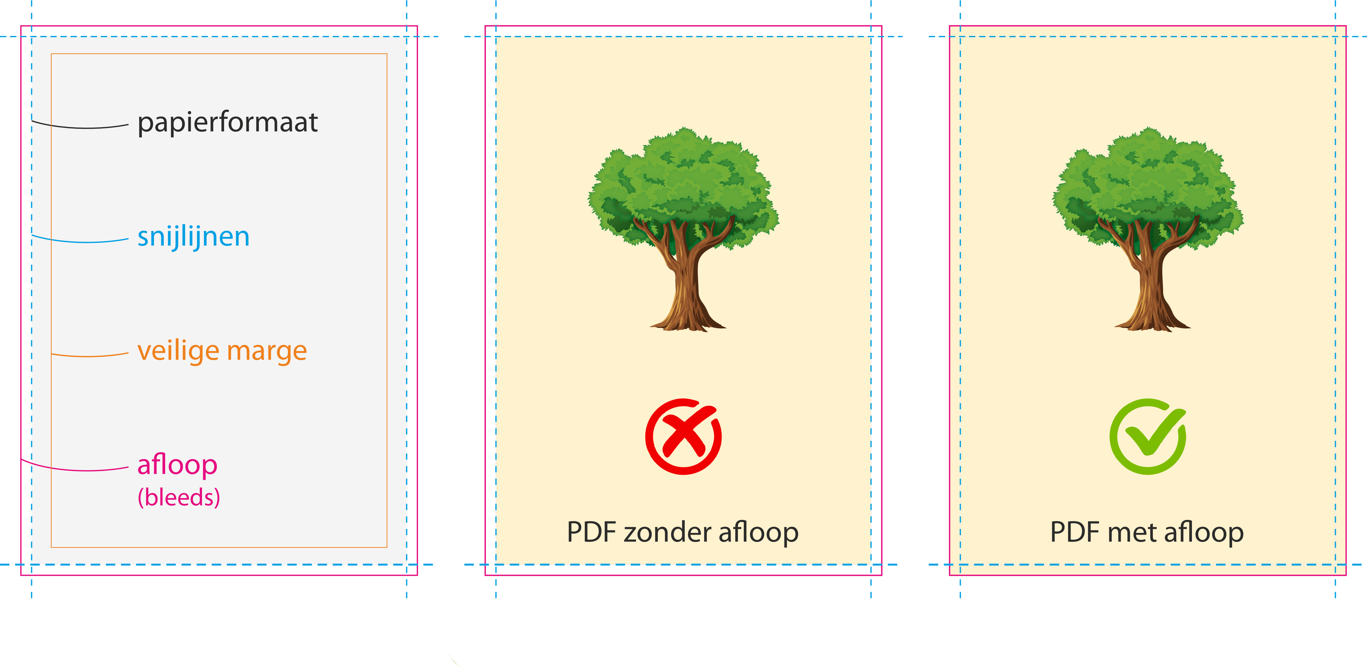 Neem bijvoorbeeld een A4 formaat. Deze heeft een afmeting van 297x210mm. Inclusief een afloop (bleeds) van 2mm aan iedere zijde wordt het aan te leveren document 301x214mm.